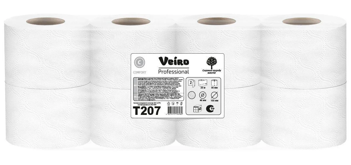 Туалетная бумага Veiro Professional Comfort T207, 2-слойная, 25 метров, белая, 8 рулонов в упаковке/