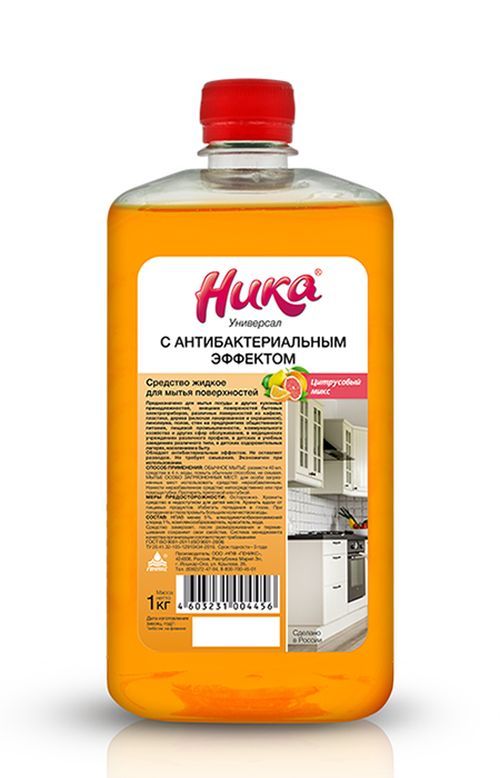 Моющее средство «Ника Универсал» с антибактериальным эффектом 1 кг — концентрированное жидкое универсальное средство для гигиенической уборки посуды и кухонных поверхностей, полов, стен и других поверхностей в доме и других помещениях.