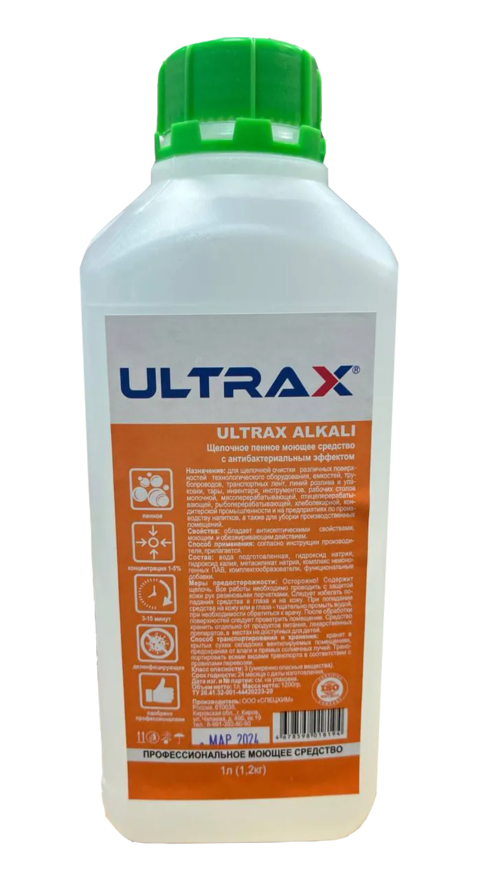 «ULTRAX» 1 л — щелочной пенный моющий концентрат, предназначенный для эффективного удаления комбинированных масложировых, белковых и других органических загрязнений с поверхностей тары, посуды, инвентаря, а также устойчивых к щелочам поверхностей полов и стен.