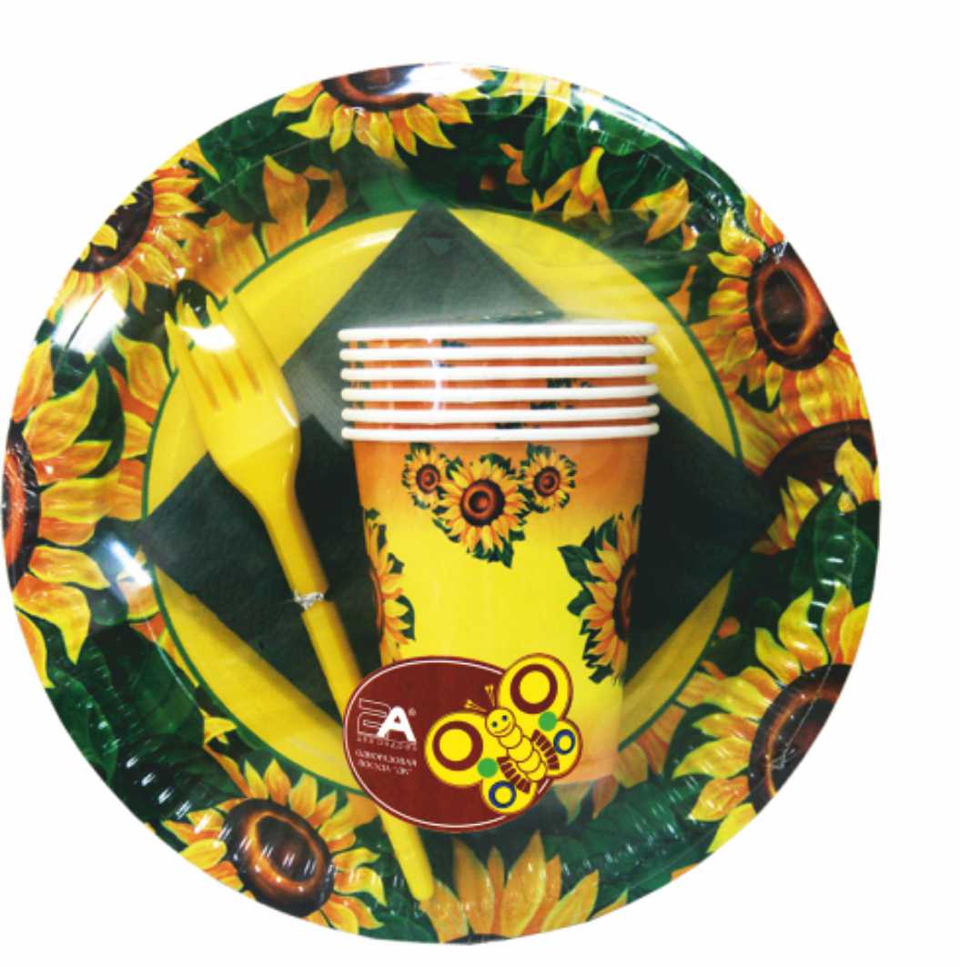 В набор входят: тарелки бумажные 6шт, стаканы бумажные 0,2 л 6шт, вилки пластиковые желтые 6 шт, салфетки зеленые