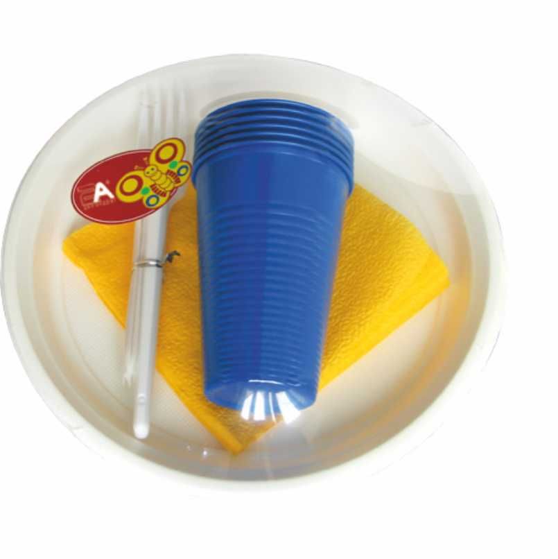 В набор пластиковой посуды входят: тарелки  6шт, одноразовые стаканы синие 6 шт, одноразовые вилки белые 6шт,  салфетки желтые, зубочистки в индивидуальной упаковке 6 шт
