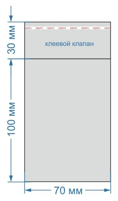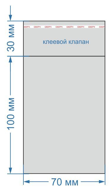 Размер пакета: 70х100 мм, с клеевым клапаном 30 мм. Толщина: 25 мкм. В упаковке 100 штук.